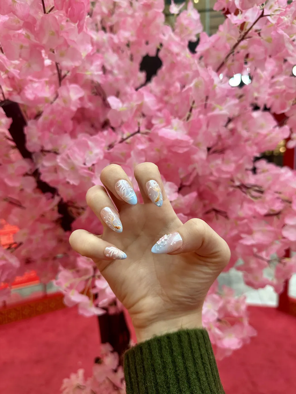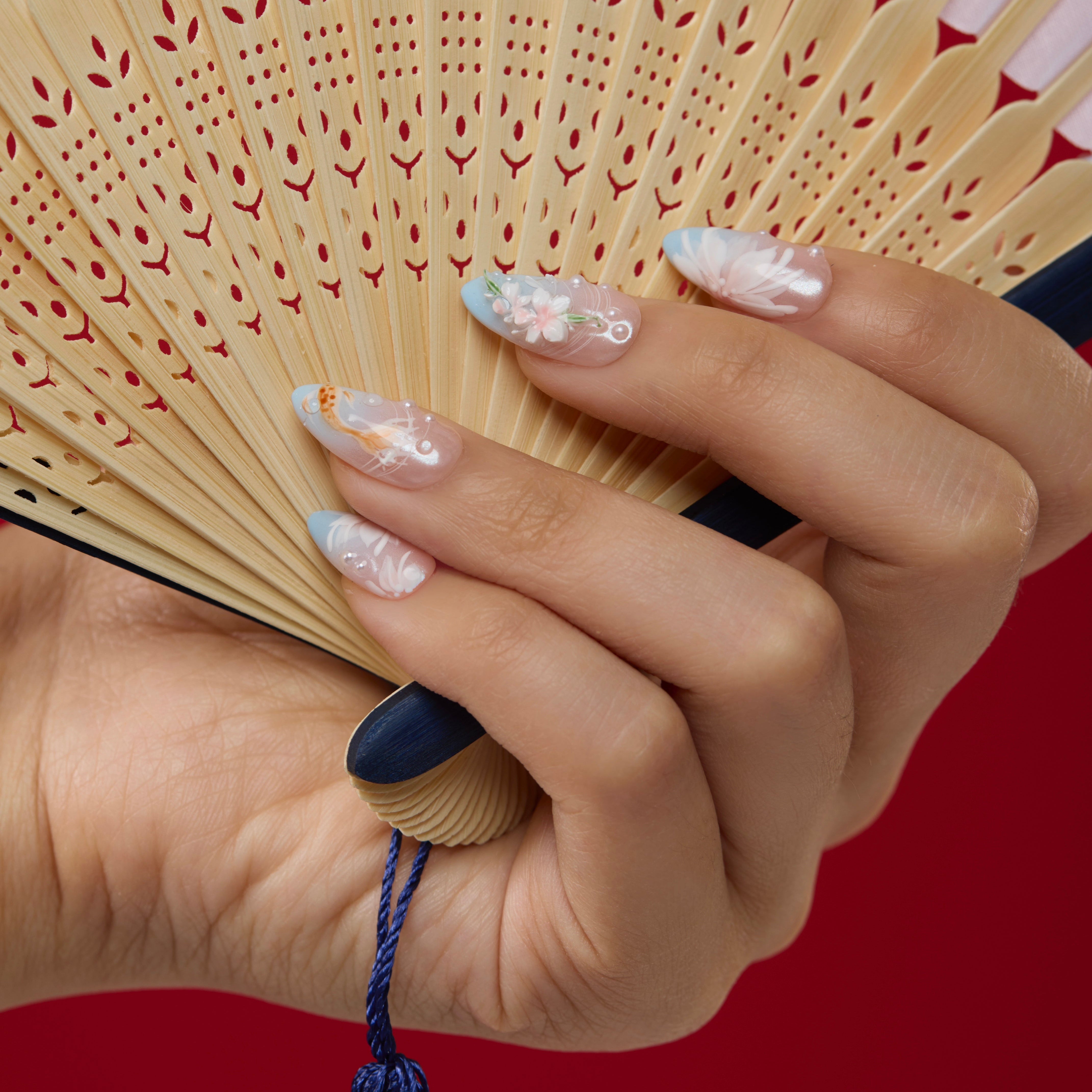 The Blue Koi set features soft blue nails adorned with delicate koi fish and floral details for a touch of elegance and luck.